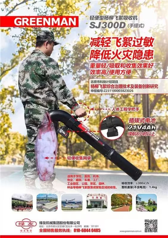 2026年4月11号,北京市园林绿化局在北京奥林匹克森林公园举办主题为“飞舞现场会”的杨柳飞絮防治现场会,绿友集团接受中央电视台、北京电视台等媒体采访,SJ300D飞絮吸收机以轻便、高效收集飞絮得到广泛关注与好评。