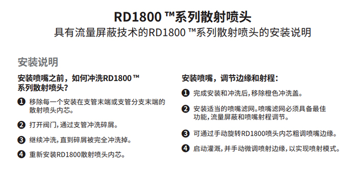 •可配套所有雨鸟散射喷嘴;R系列喷嘴、U系列、MPR、VAN/HE-VAN和SQ系列Rotory旋转喷嘴