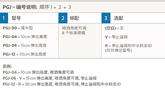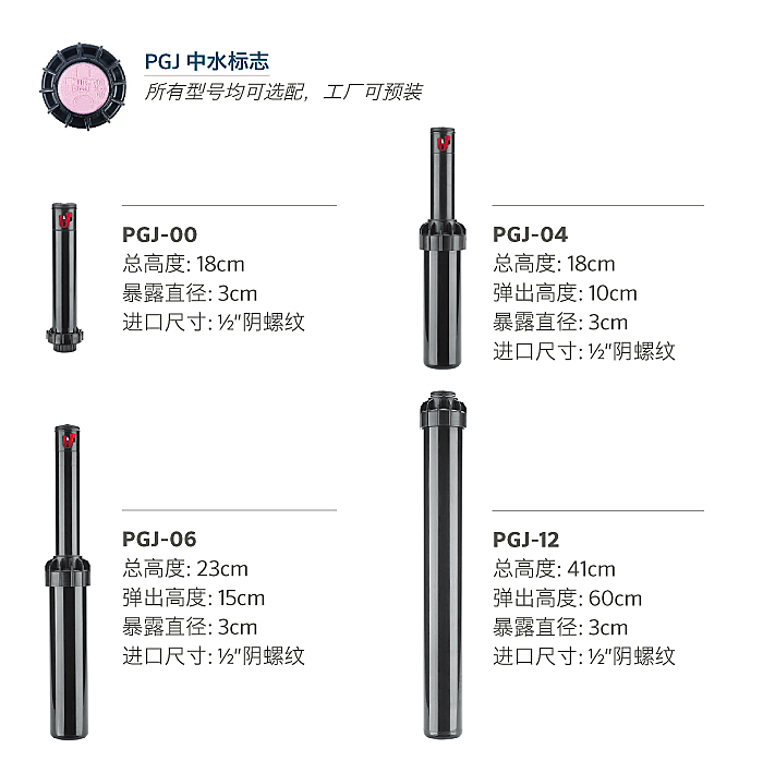 弹出高度: 灌木型,10cm,15cm,30cm 建议工作压力: 1.7~3.8 bar; 170~380 kPa
