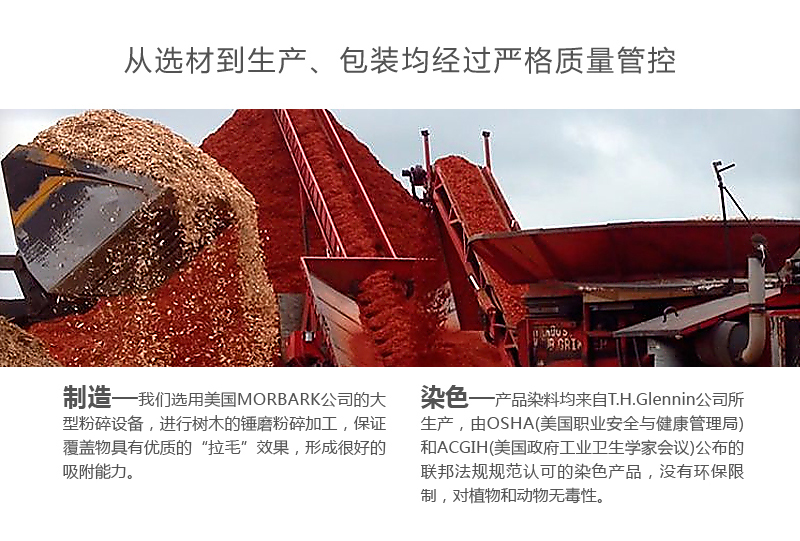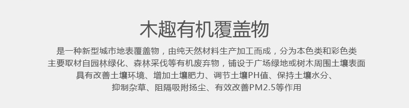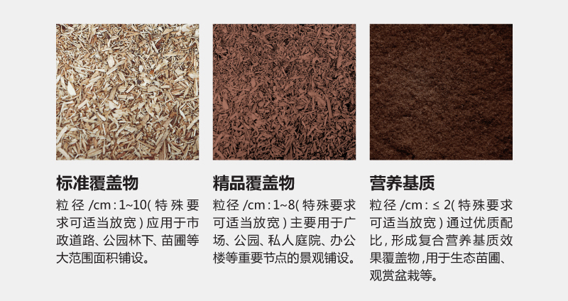 主要取材园林绿化,森林采伐等有机废弃物,铺设于广场绿地或树木周围土壤表面。
