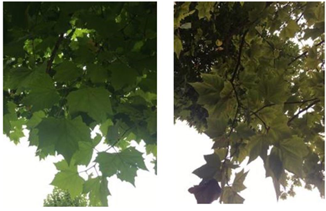处理(左)叶片浓绿,对照(右)网蝽危害严重,叶片基部黄化