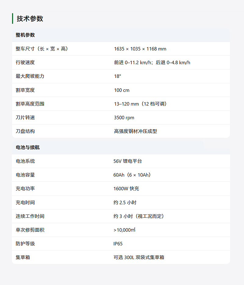 • ● 长效续航能力:60Ah 大容量电池平台,2.5 小时快充,单次修剪面积可超过 10,000㎡。