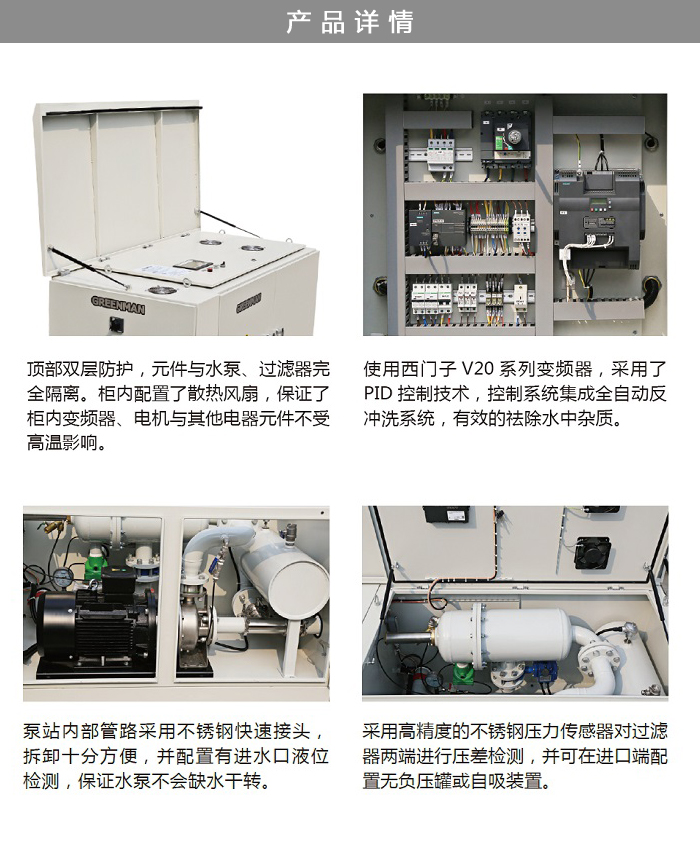 ● 精确的压力控制,系统内置PID控制器,根据系统管道压力的变化情况,自动调节输出流量,满足喷头正常工作要求