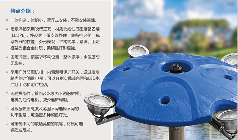 GREENMAN漂浮式喷泉系统可为您呈现水和光交相辉映的神奇喷泉景象,又可增加水体活性,适用于人工或自然湖水体,亲水别墅,生态住宅,高尔夫球场,生态休闲乐园等景观水域的水体净化,增氧和造景。