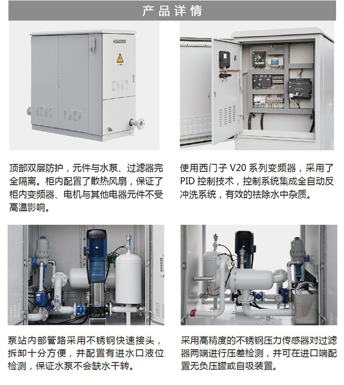 4、采用防护型一体式泵房,外壳材质为钢板,喷塑处理,内置排风系统